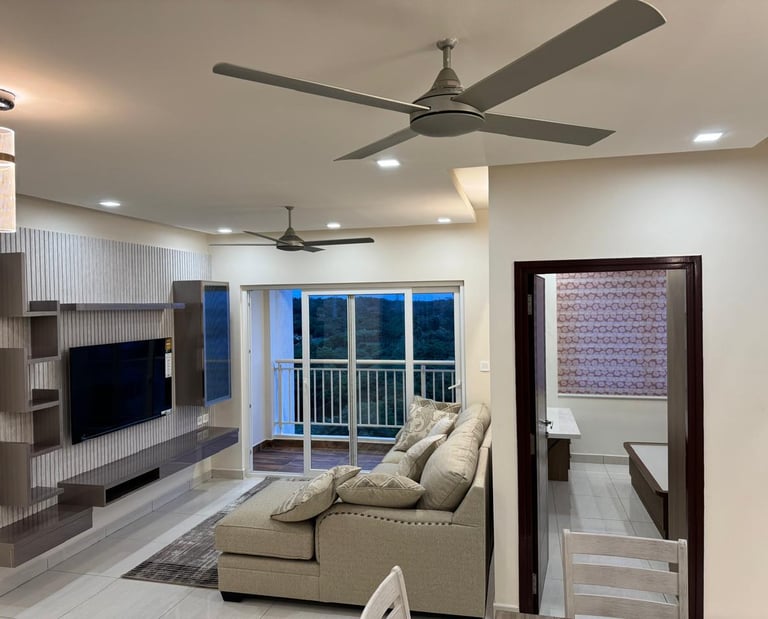 The furniture of the living & dining matched the flooring with soothing colors and the floor carpet had an abstract design which stands out by itself. The kitchen had dual color with acrylic laminate finish. The light fixtures and ceiling fans were truly remarkable with elegant design.