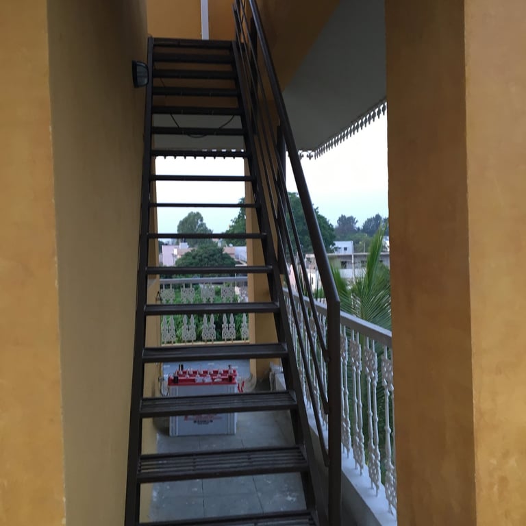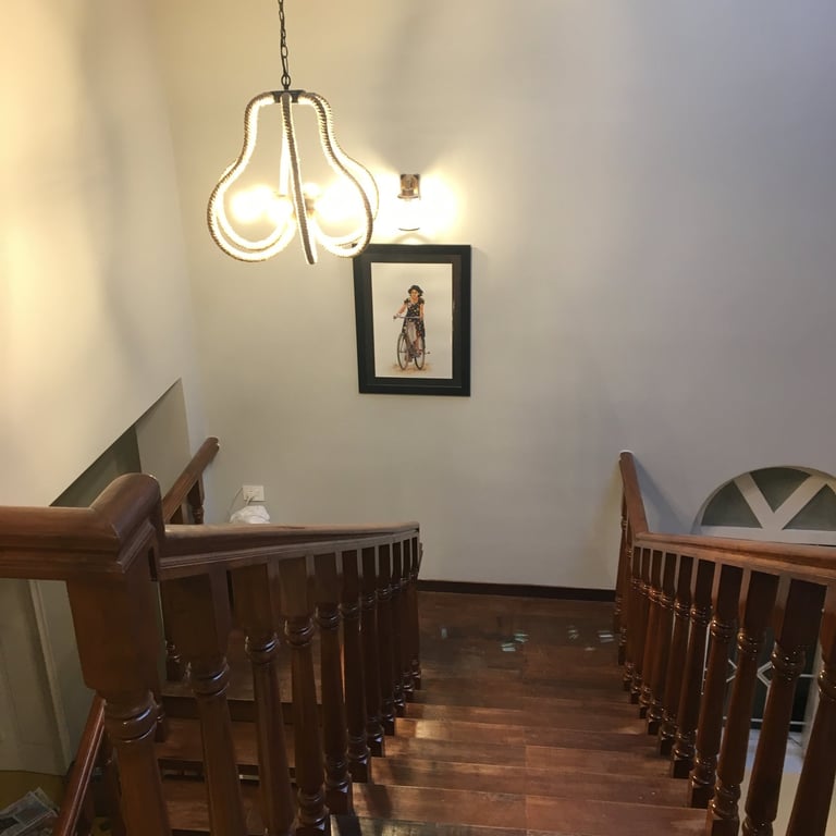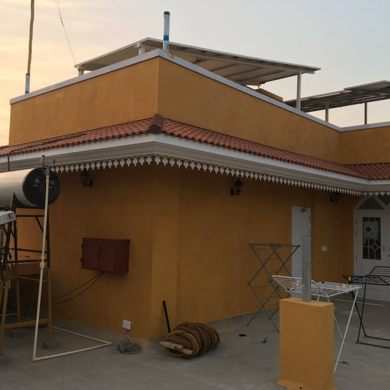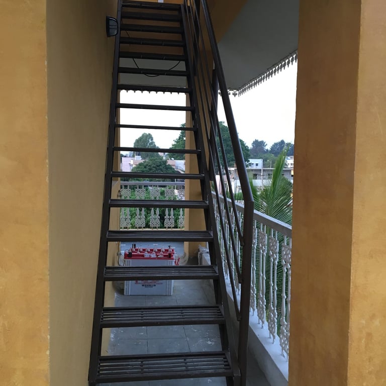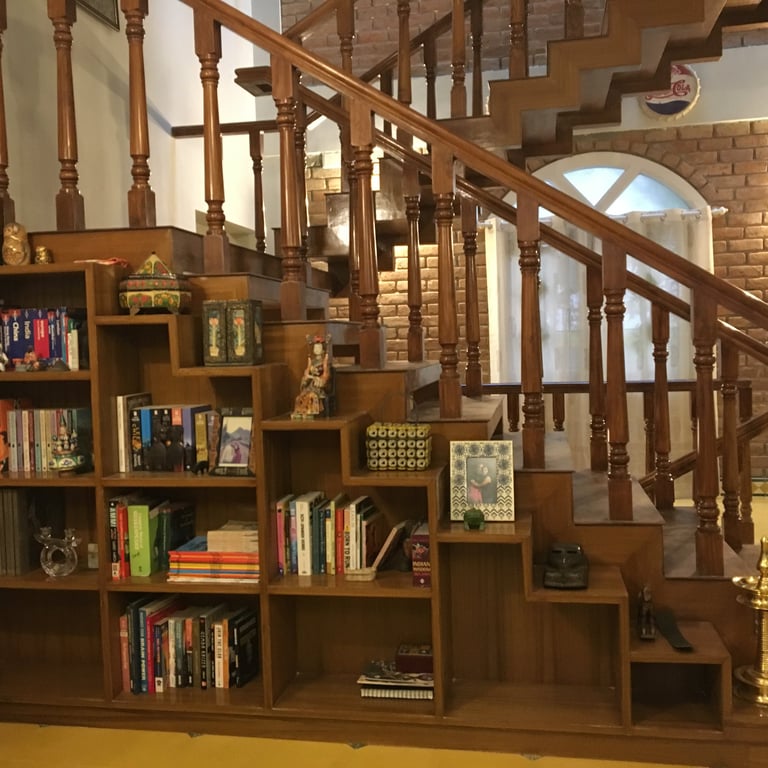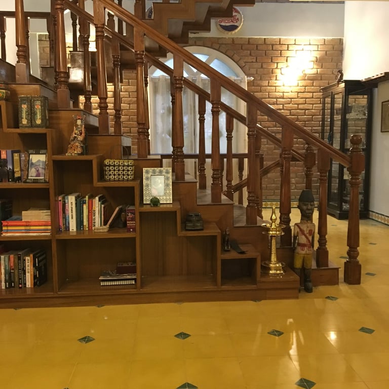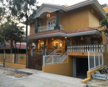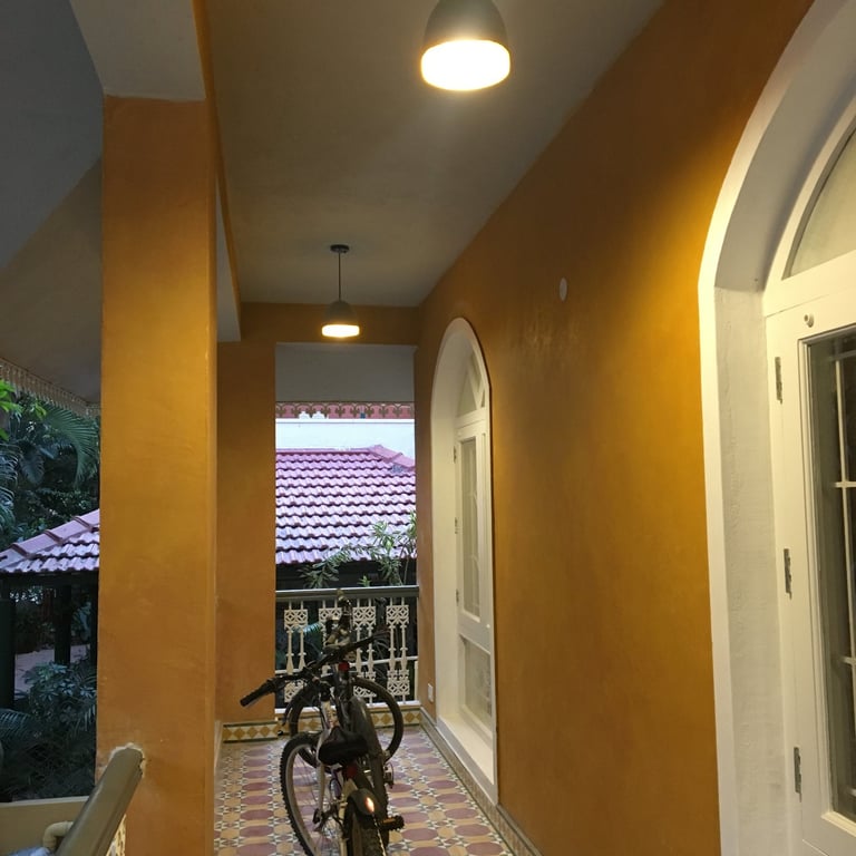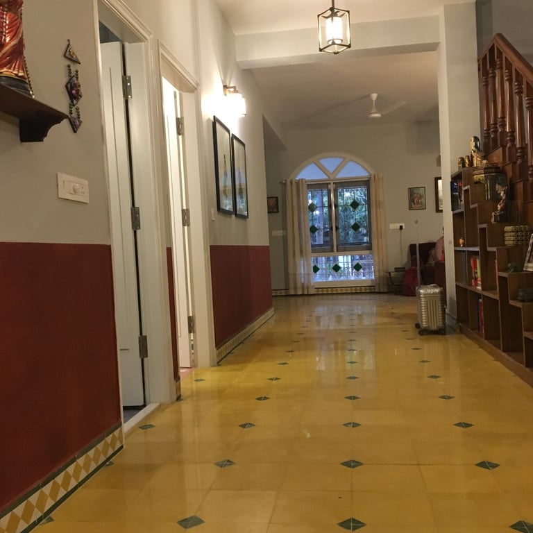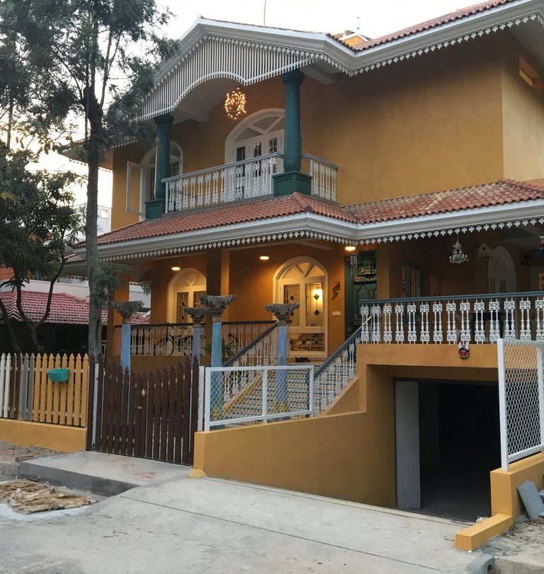 This residence is vernacular in style with Exposed brick walls in the staircase area, slope roof with metal trelliesrunning all round the eaves board with white in color paint. The entire home is painted with ochre, yellow & white which stands out in the lush greens of the ferns. This house is self-sustained & renewable energy efficient with rainwater harvesting, solar panels and STP. (Sewage Treatment Plant).