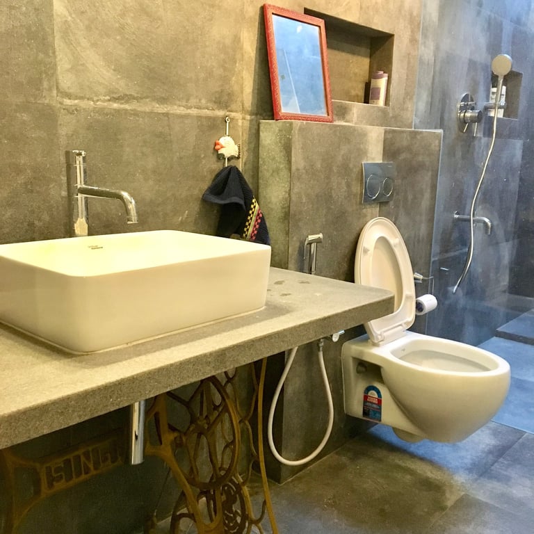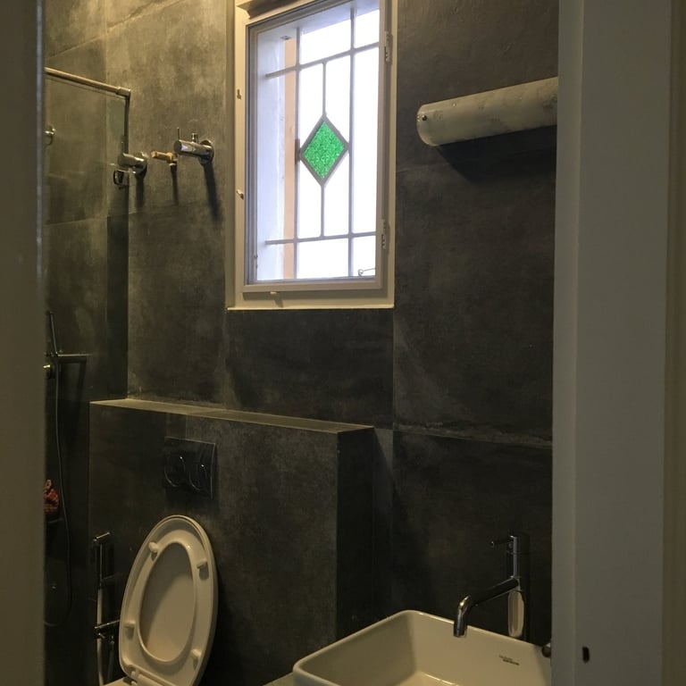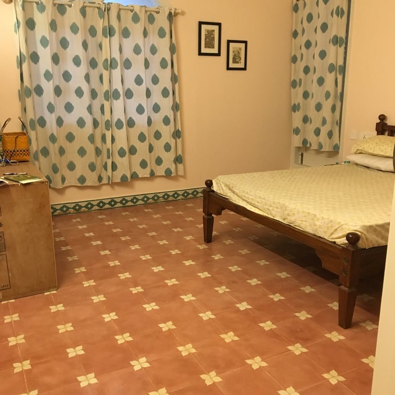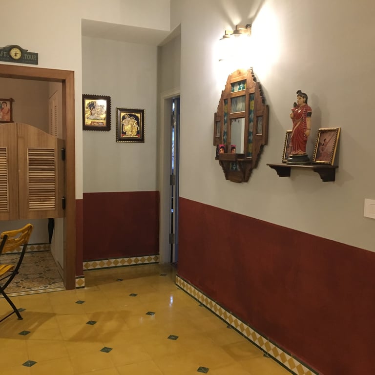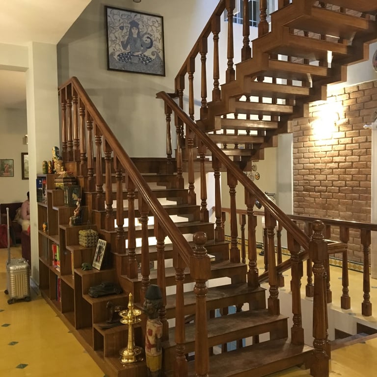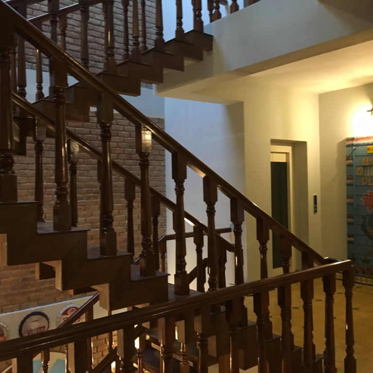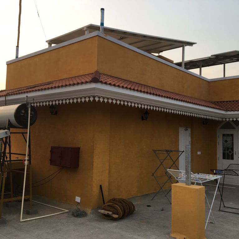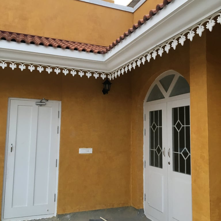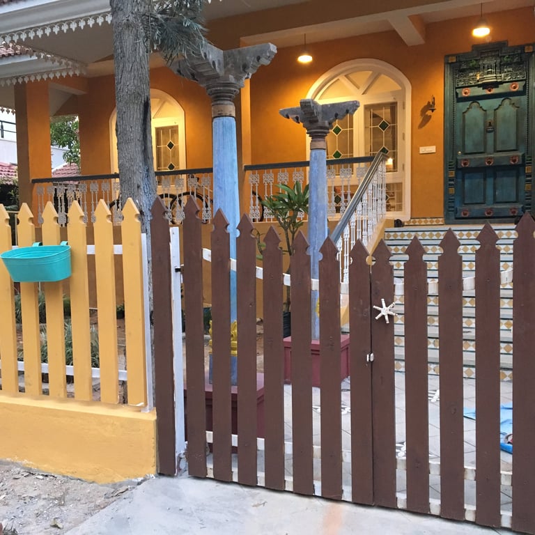 This residence is vernacular in style with Exposed brick walls in the staircase area, slope roof with metal trelliesrunning all round the eaves board with white in color paint. The entire home is painted with ochre, yellow & white which stands out in the lush greens of the ferns. This house is self-sustained & renewable energy efficient with rainwater harvesting, solar panels and STP. (Sewage Treatment Plant).