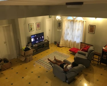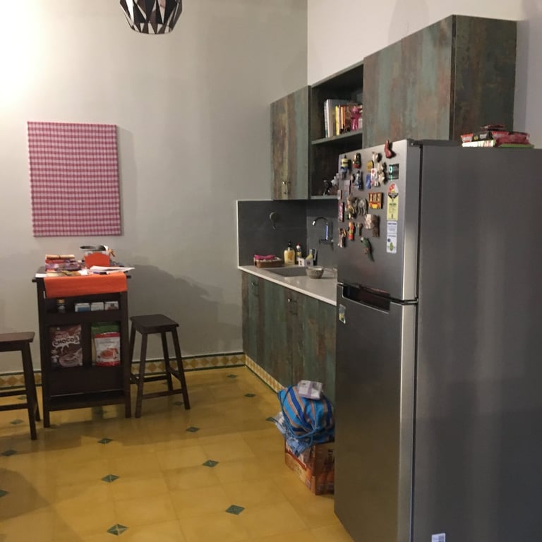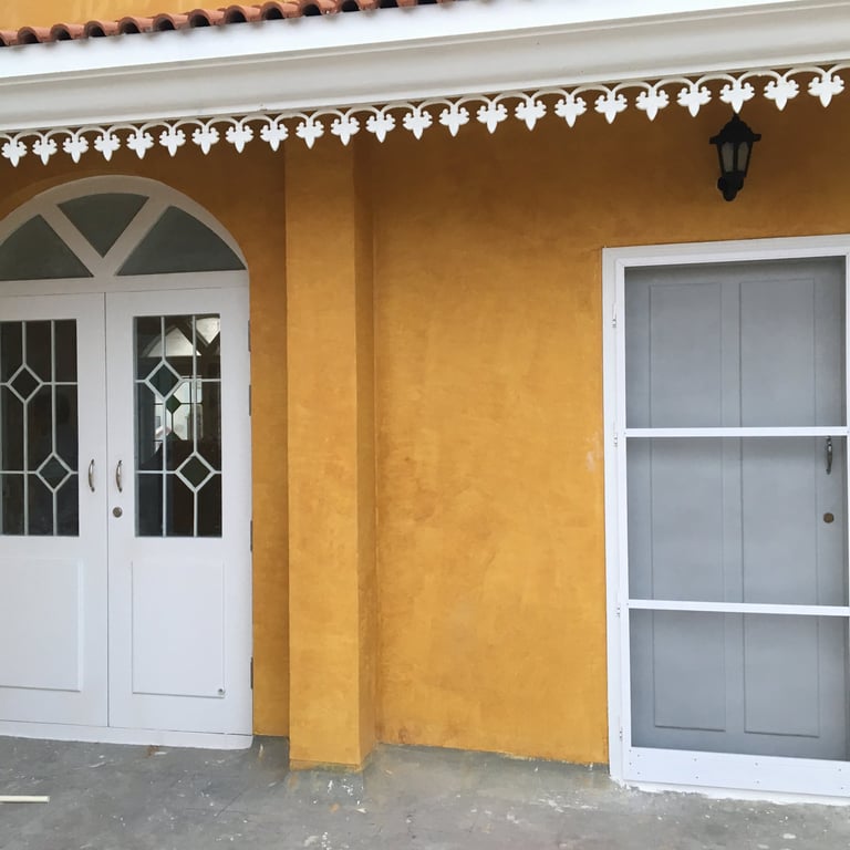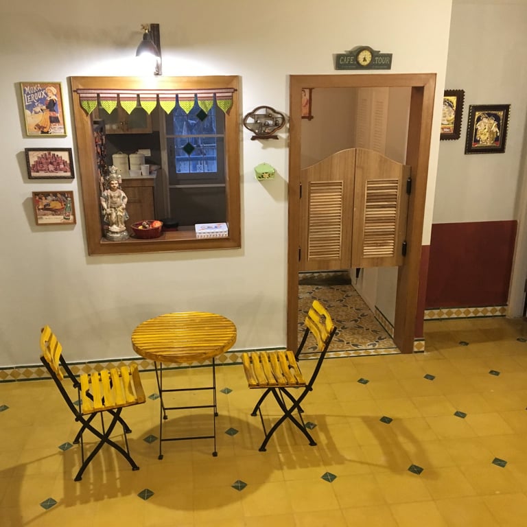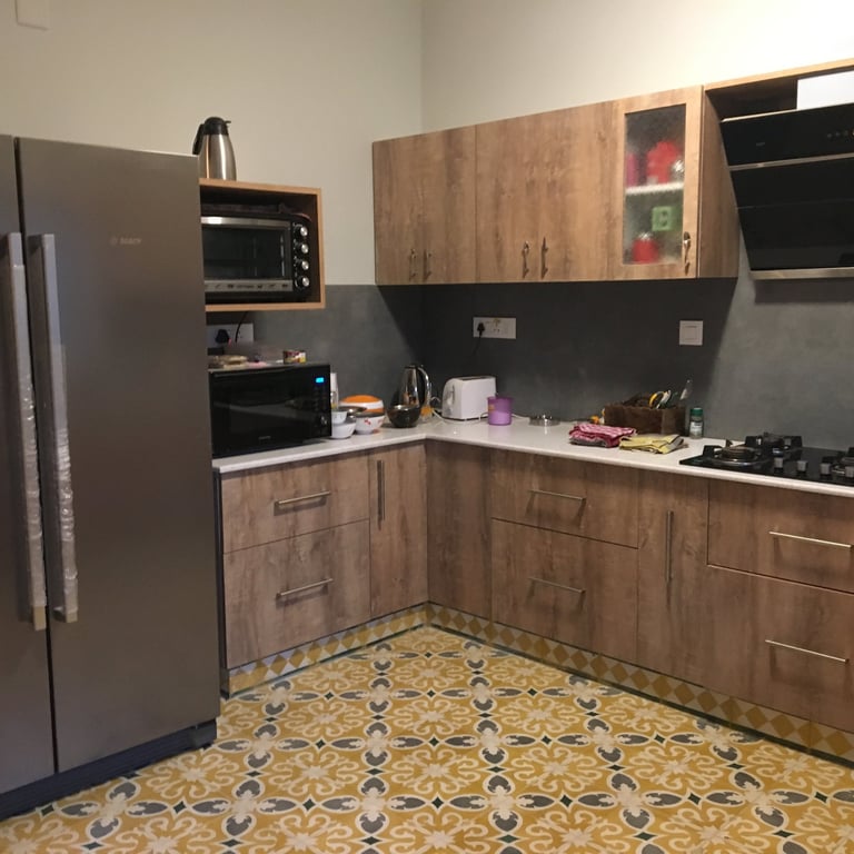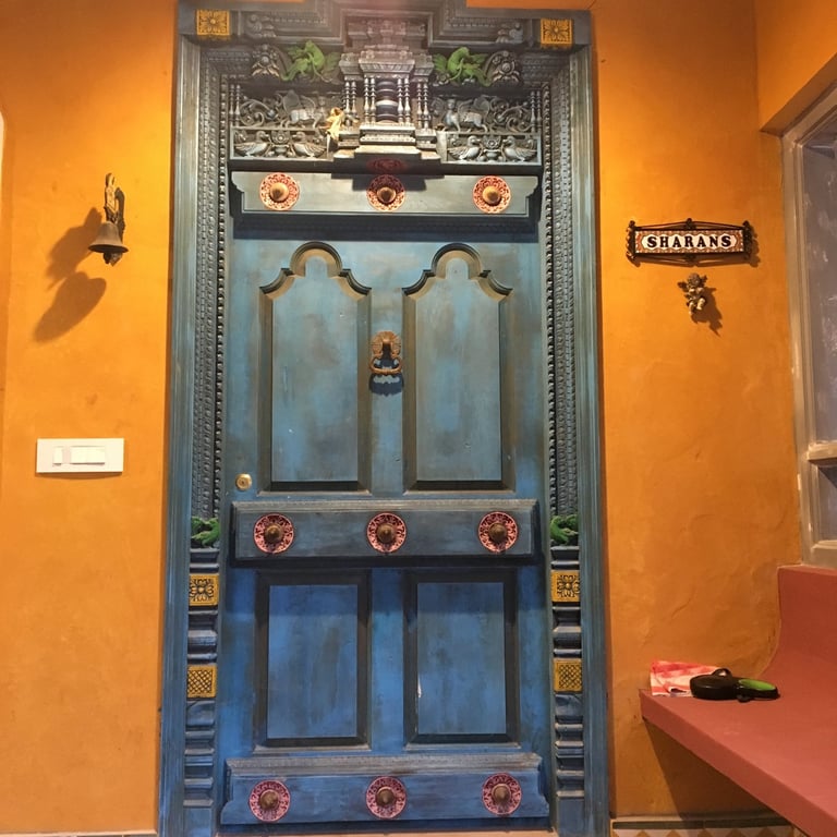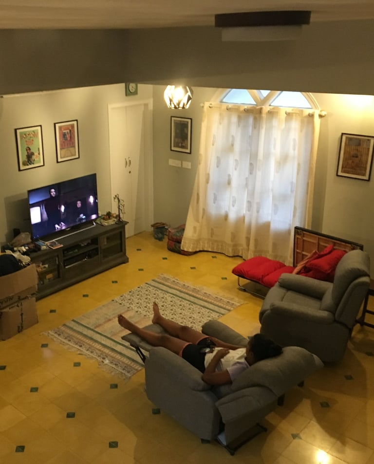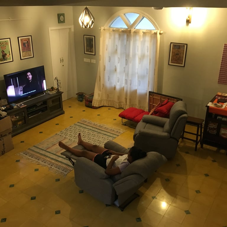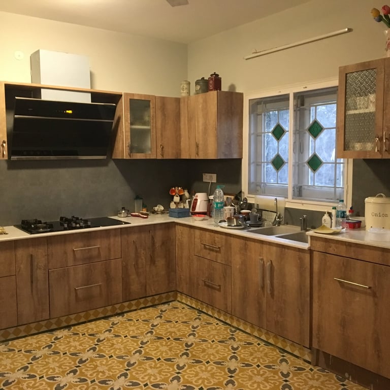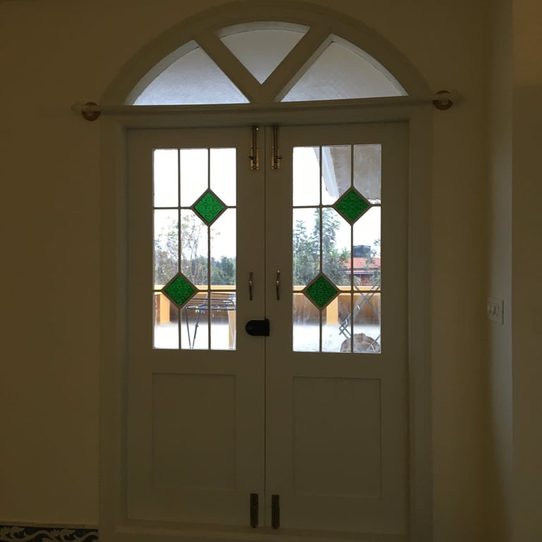 This residence is vernacular in style with Exposed brick walls in the staircase area, slope roof with metal trelliesrunning all round the eaves board with white in color paint. The entire home is painted with ochre, yellow & white which stands out in the lush greens of the ferns. This house is self-sustained & renewable energy efficient with rainwater harvesting, solar panels and STP. (Sewage Treatment Plant).