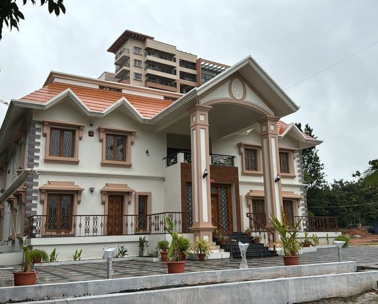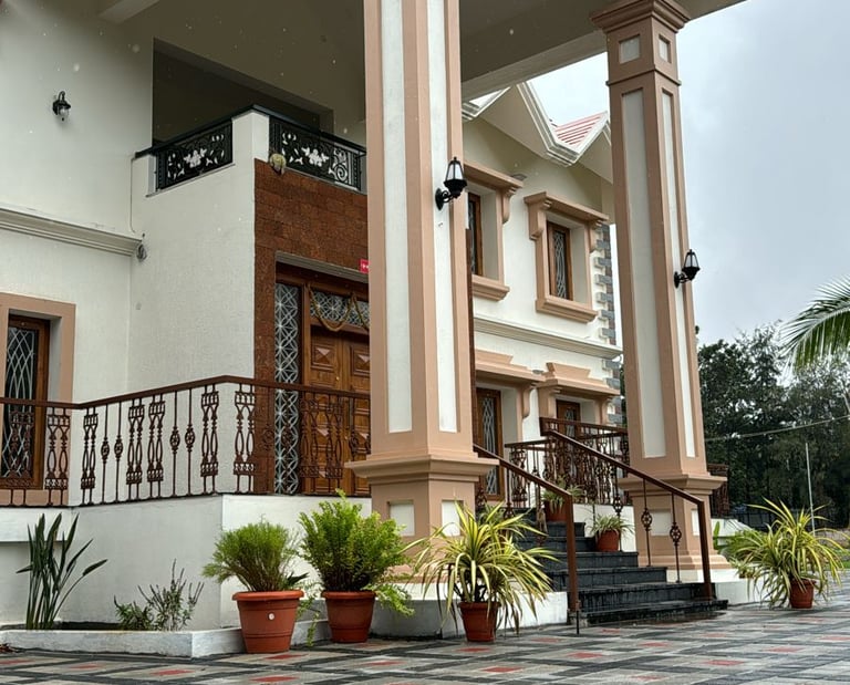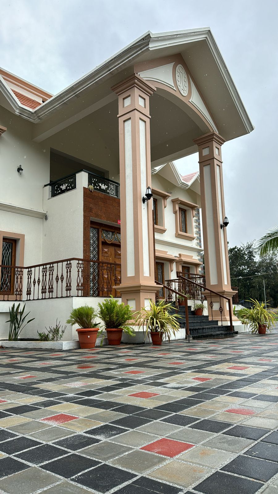 This residence has living, dining, office space, pooja, central courtyard, Lift & staircase, media room, library, store & utility. The basement floor has a car park with indoor swimming pool & servant quarters. The entire house is designed as per vastu and all the materials used in this project are natural materials Like – Kota stone flooring, Jaisalmer stone flooring, Attangudi tiles, Exposed brick wall in the Dining, Stone and cast-iron grill in the exposed brick wall of the pooja, Jali wall in the living as a partition wall for the hand wash. The central courtyard with skylight is the focal point of the residence. The façade of the residence is of early European style with slope roof, pillars with pediments & roof cornices. The corner of the façade is treated with stone cladding. The rich flora & fauna in the site increases the Oxygen levels. The entire residence is a self-sustainable with renewable energy such as Rainwater harvesting, Solar panels for power.